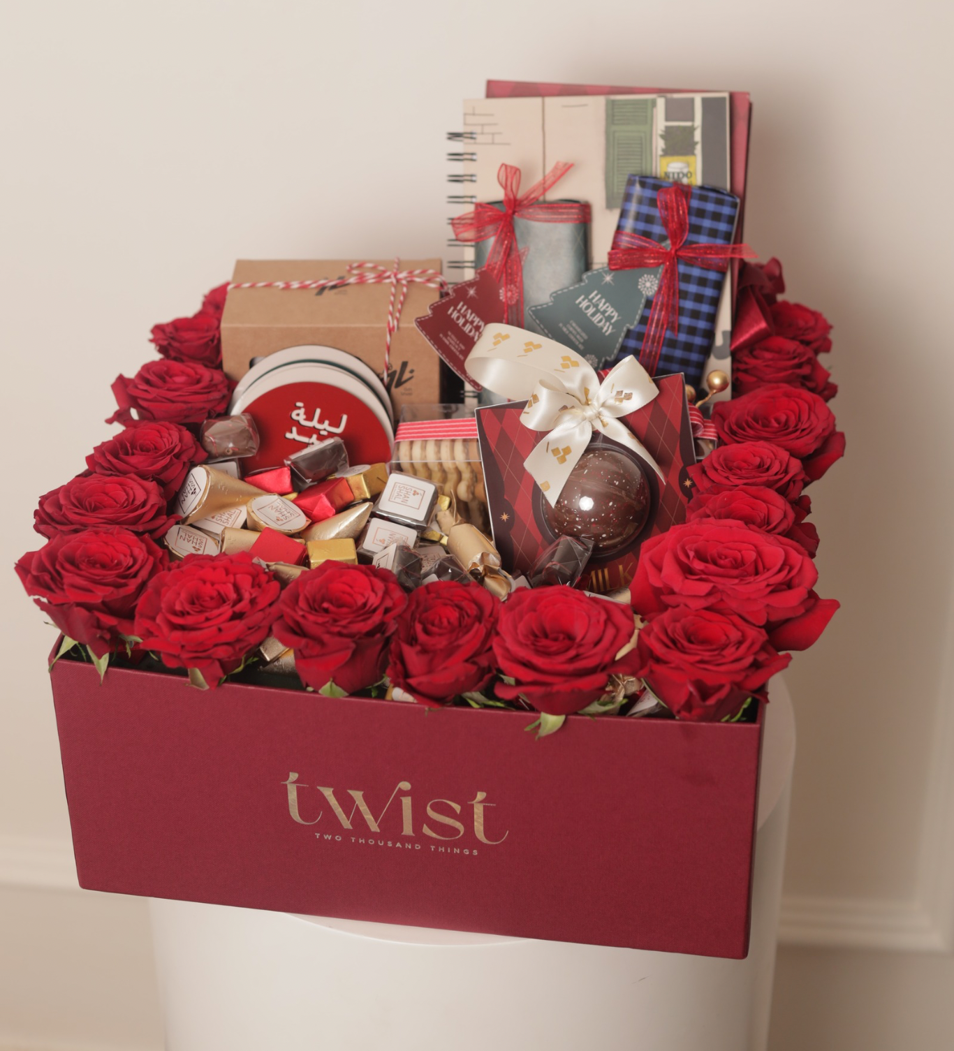Surprise your loved one with a luxurious gift box curated to impress. This elegant hamper is filled with premium treats and thoughtful keepsakes, beautifully arranged with fresh red roses for a truly unforgettable experience.