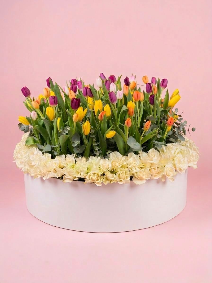Unleash the beauty of nature with the Roses & Tulip Majesty! This stunning 80cm round wood box is filled with vibrant roses and tulips that command attention. Each bloom invites you to embrace life's adventures, inspiring bold choices and daring moments. Elevate your space with this floral masterpiece and conquer your surroundings!
