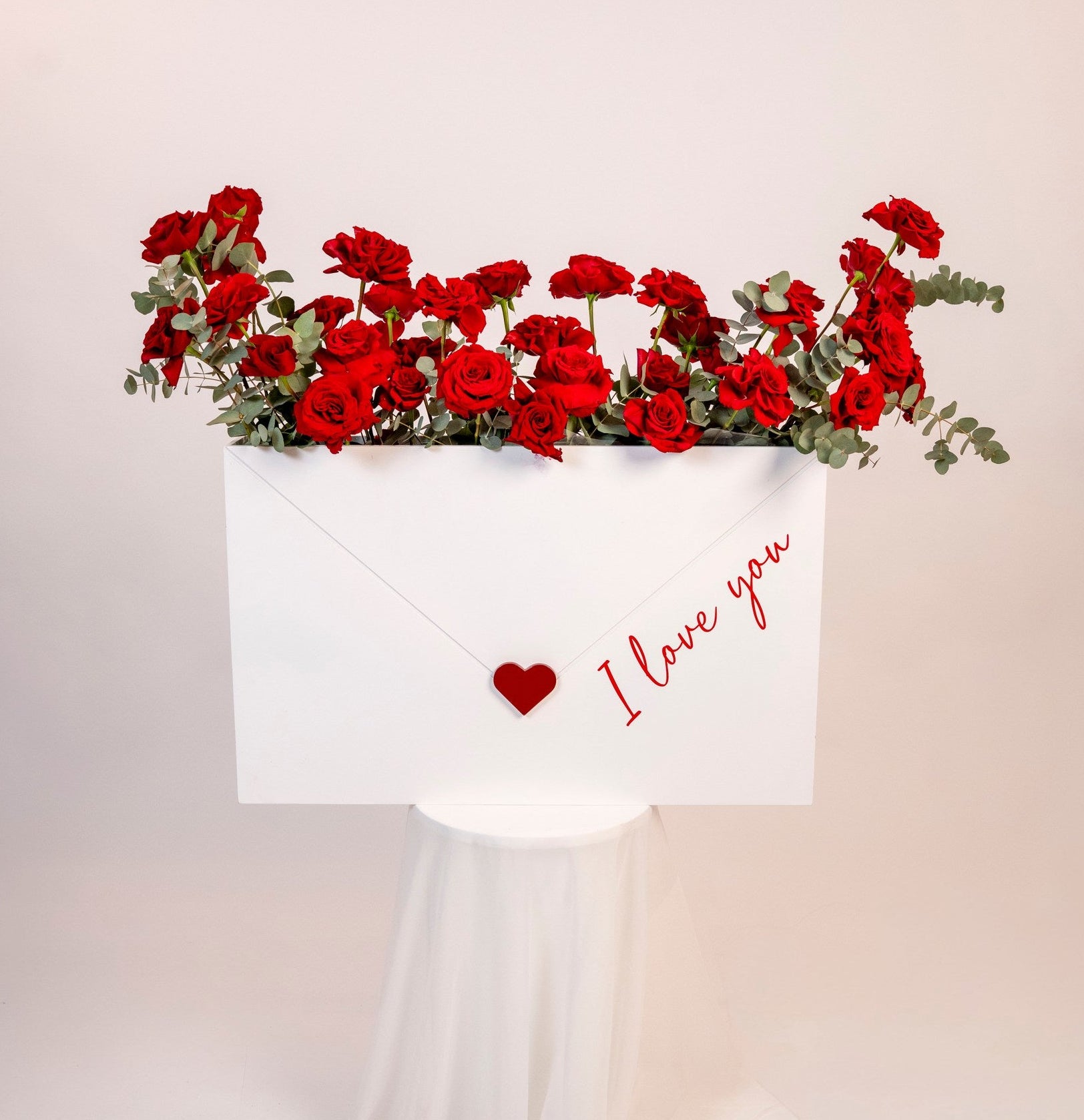 A charming wooden mailbox overflowing with a blend of 50 red and 20 light pink roses. Accented with viny! lettering, this unique arrangement delivers a heartfelt message in a truly creative way