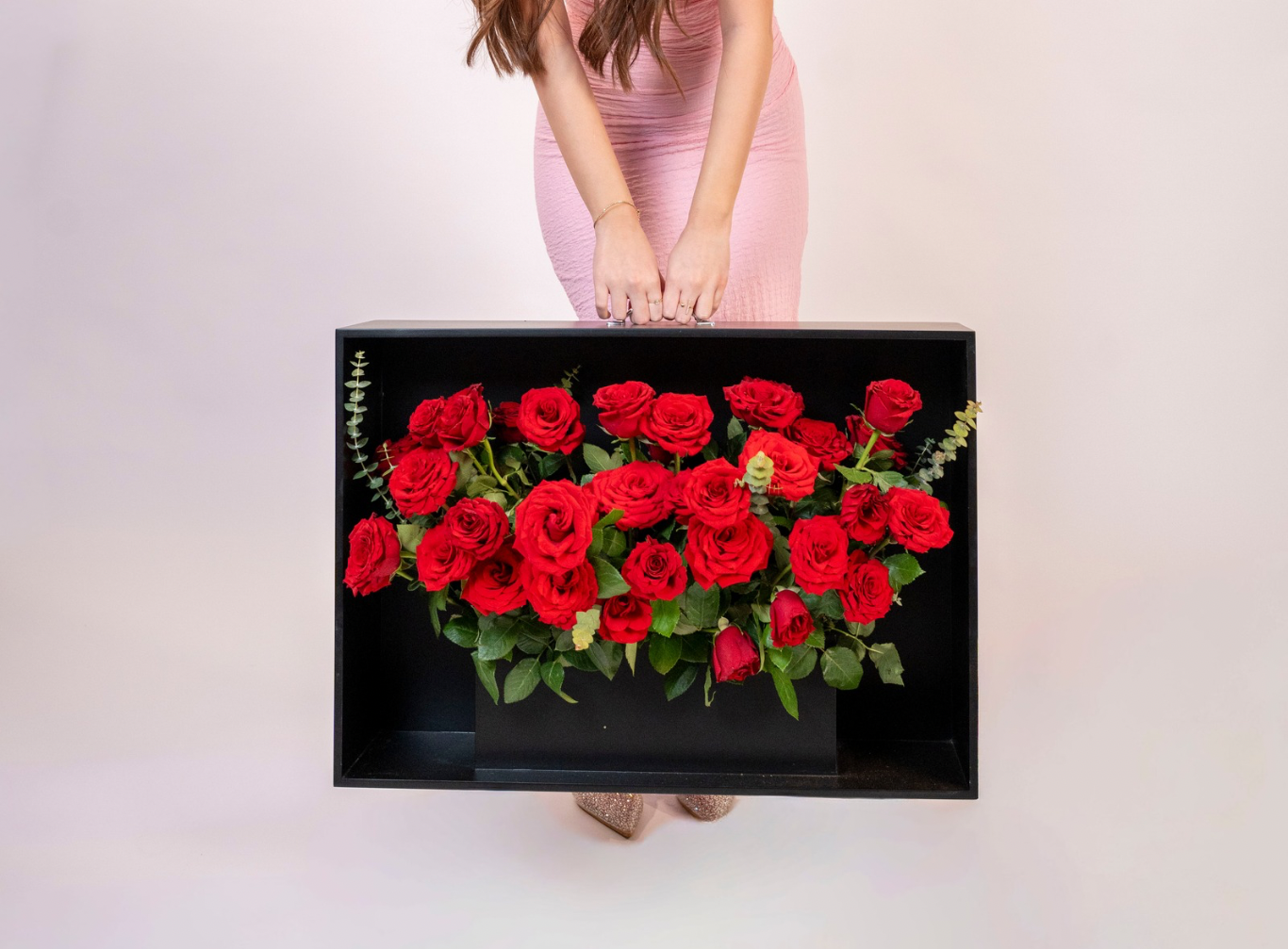 A stylish "fluffy style" arrangement of 40 red roses and fresh eucalyptus presented in a unique black wood bag box. This modern, portable design is the perfect statement of chic romance