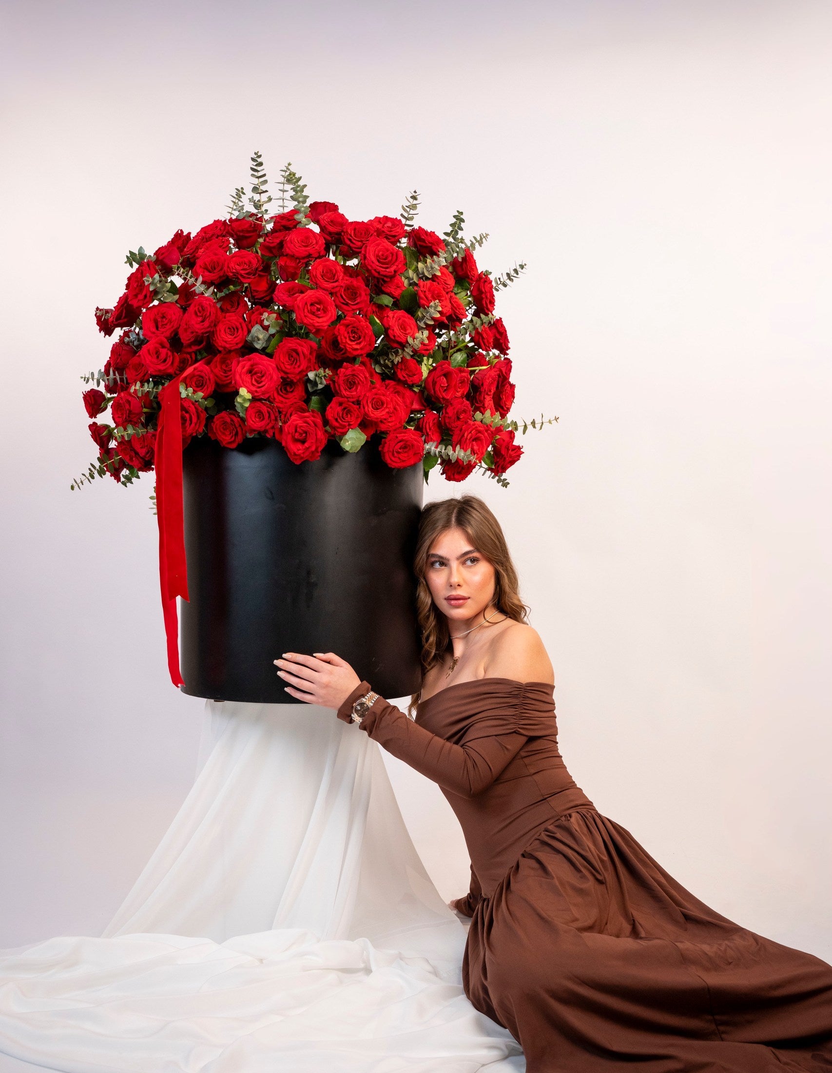 A lush, high-volume arrangement of 220 red roses and eucalyptus on a rustic wood base. A bold, textured centerpiece designed to command attention in any room